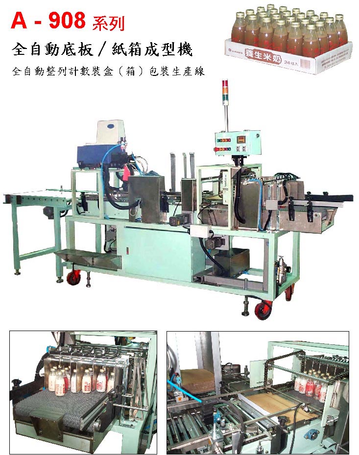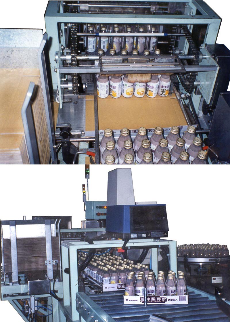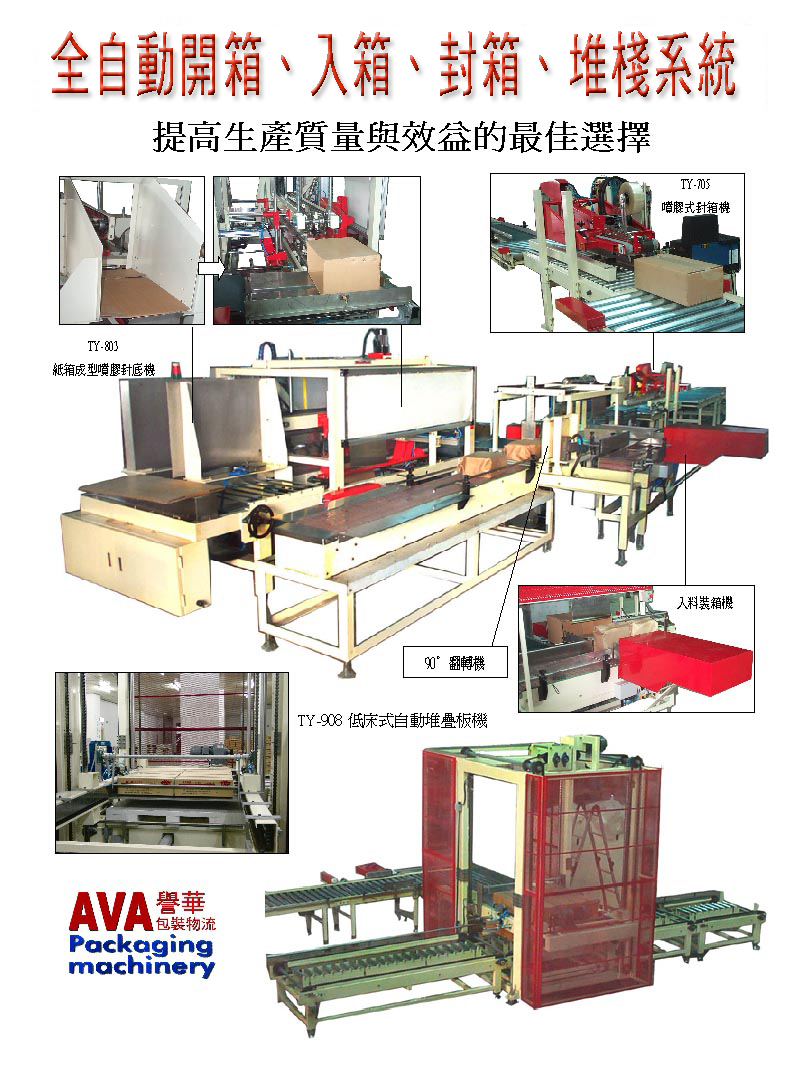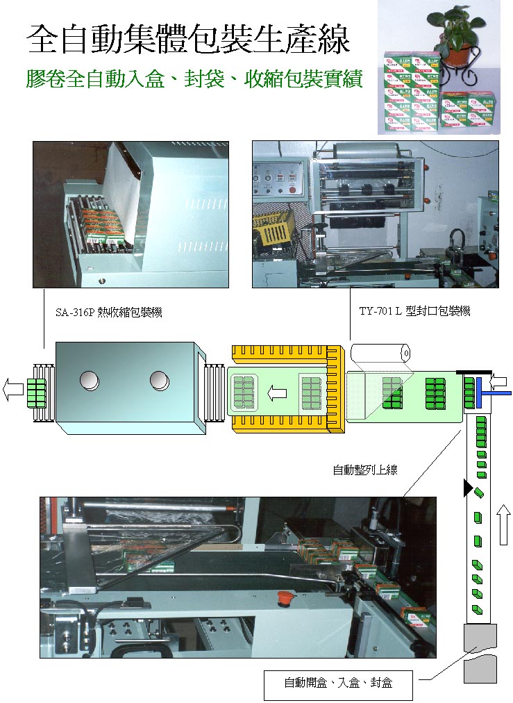 專案設計全自動包裝生產線聯機系統: 「紙箱全自動裝箱堆棧生產線」 「小紙盒全自動集體熱收縮包裝線」